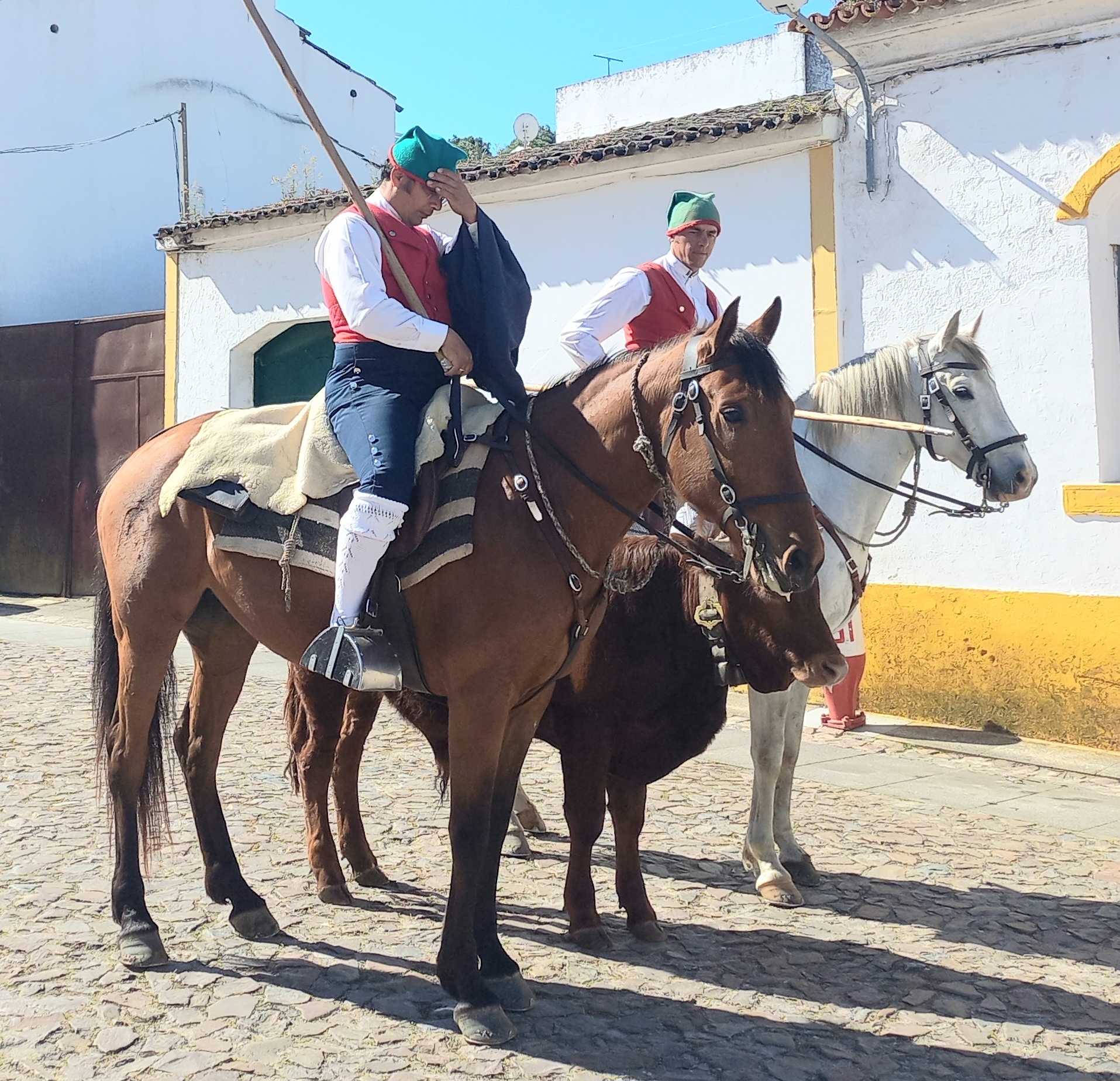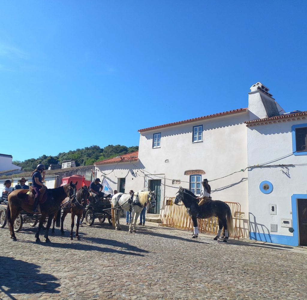 Départ toujours sous le soleil ce 27 Avril pour continuer notre périple dans l’Alentejo et vers la côte. Un arrêt au beau bourg Viana de l’Alentejo. Surprise on tombe sur une procession relative à la Romaria a Cavalo. Du 22 au 27 avril, les pèlerins parcourront à nouveau 150 kilomètres, à cheval ou en calèche, pour conduire Notre-Dame de Boa Viagem, de Moita, à Notre-Dame d’Aires, à Viana do Alentejo.